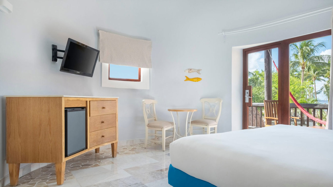 In the Suites at Iberostar Cozumel Hotel you’ll have plenty of space just for you. The large bedroom has a king-size bed, as well as a dressing room and private balcony with a hammock, so you can relax while you rock from side to side, gazing at the lush vegetation surrounding the hotel. The room also has a living room with a sofa bed and television.